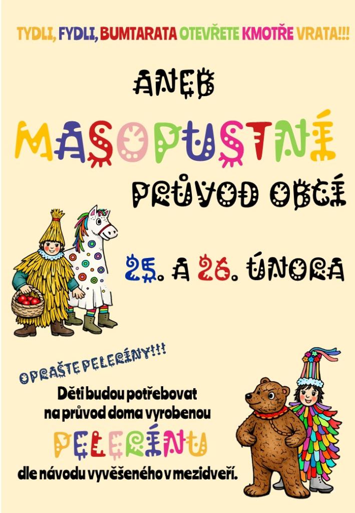 Tradiční masopustní průvod obcí v originálních pelerínách a maskách.