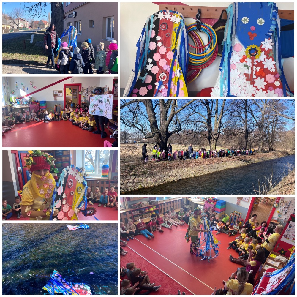 Další vzácnou návštěvu, kterou jsme v březnu v naší školce přivítali byli kamarádi z Německa. V rámci příhraniční spolupráce za námi přijeli němečtí kamarádi a my jim mohli ukázat další z našich tradic, které s dětmi každoročně dodržujeme. Jednou z nich je právě loučení se s paní zimou, tzv. vynášení Morany. A protože jsme věděli, že na tuto akci k nám přijede partnerská škola z Německa, připravily paní učitelky společně s dětmi Morany hned dvě, v barvách české i německé vlajky. A kdo jiný nám mohl Morany přinést než jarní skřítek Kvítek, kterého k nám povolal Skřítek HiHi. To bylo panečku ve školce pozdvižení, když se zase objevili dva skřítkové. Skřítek HiHi se rozloučil a předal vládu jarnímu skřítkovi. Skřítek Kvítek se seznámil s dětmi, zkoušel dokonce i pár slovíček německy a předal dětem klíč Petrklíč, kterým děti společně odemkly přírodu se zimního spánku. Skřítek předal dětem vyrobené Morany a nic nebránilo tomu, vyrazit k místní říčce. Každá školka si tak mohla hodit do místní Chomutovky svoji Moranu. Loučení se s paní zimou jsme tak spojili s příjemnou jarní procházkou, protože ten den nám opravdu přálo počasí a sluníčko nám svítilo na cestu. Koncem měsíce jsme tedy s dětmi zahájili nový projekt: „Vítáme jaro se skřítkem Kvítkem.“, který započal vynesením Morany a odemčením jarní přírody. Již samy děti začaly pozorovat na zahradě MŠ první Sněženky, Krokusy a Sedmikrásky. 😊