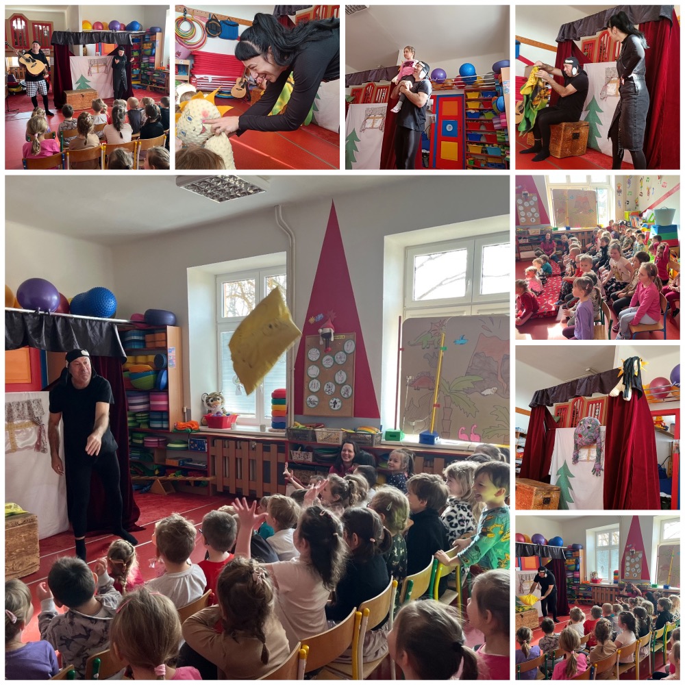 Hned začátkem měsíce jsme v naší školce přivítali pana Pohodu a jeho divadlo z bedny. Pan Pohoda si pro děti připravil poučnou pohádku „Pejsek a sluníčko.“ Děti se na divadlo vždy těší, protože je pan Pohoda umí zaujmout nejen hrou na kytaru a chytlavými písničkami, ale i samotným dějem a vtipným obsahem pohádek. Děti vtáhne do pohádky i prostřednictvím nějaké konkrétní role, kdy se děti promění v nějakou pohádkovou postavu nebo zvířátko.