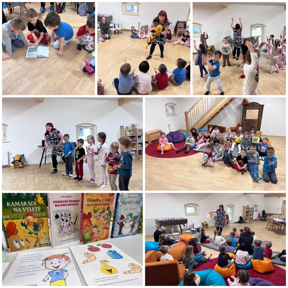 V rámci březnového projektu „Skřítek Hihi a jeho knihy“ jsme s dětmi navštívili i místní knihovnu. Od místního klubu seniorů jsme dostali s dětmi pozvání na autorské čtení dětských knížek se spisovatelkou Lenkou Jakešovou. Akce probíhala ve spolupráci s obcí Údlice. Děti si mohly prohlédnout konkrétní knížky, seznámily se s háčkovanou včelkou Emičkou, která je jednou z hlavních postav v knížkách paní autorky. Děti zpívaly autorské písničky, zatančily si nebo i zahrály jako doprovod na hudební nástroje. Babičky z místního klubu seniorů si společné setkání také moc užily. Vzájemná spolupráce probíhá nadále i každé úterý u nás ve školce, kam babičky chodí dětem předčítat pohádky. Těší nás, že spolupráce s místním klubem seniorek probíhá pravidelně a již teď plánujeme další akce na společné jarní tvoření.