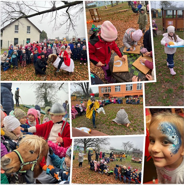 A protože máme rádi návštěvy a pro děti se snažíme vymýšlet stále nové a nové prožitky, den sv. Martina se přímo nabízel k tomu, uspořádat další parádní akci. Na tento den, jsme pozvali k nám do MŠ naše německé kamarády, se kterými pravidelně udržujeme kontakt a střídáme se ve společných setkáních. Paní učitelky vymyslely zážitkový projektový den a prostřednictvím dramatického příběhu dětem přiblížily legendu a pranostiky o sv. Martinovi. Děti měly možnost vyzkoušet házení opravdovou podkovou, nosily svatomartinskou husu, jezdily na pomyslném koníkovi a s Martinem zajeli svatomartinskou jízdu aj. Vrcholem společného dopoledne byl příjezd opravdového Martina na skutečném koníkovi, což byl pro děti ten největší zážitek. Za tento opravdu nevšední zážitek mockrát děkujeme Martínku Molnárovi a jeho mamince a jejich poníkovi Romeovi. Ten den nám sice Martin sníh nedovezl, ale o pár dní později jsme už první sněhové vločky na zahradě chytali.
