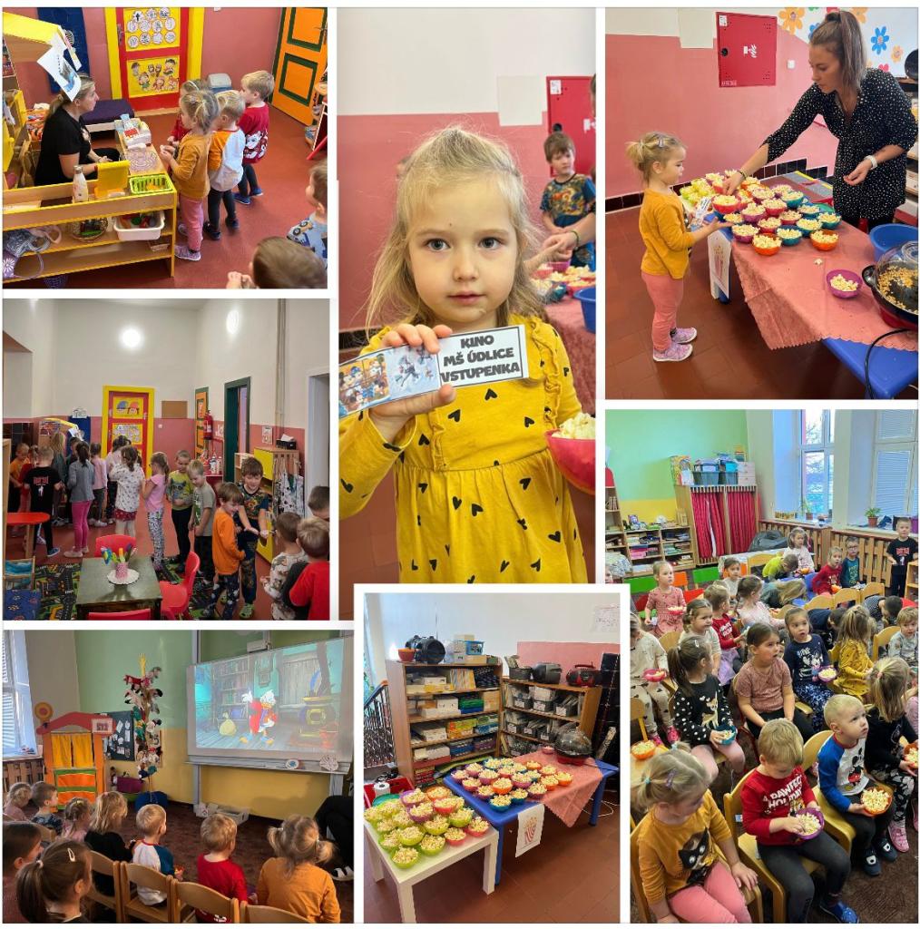 Závěr měsíce jsme s dětmi ukončili návštěvou kina – Kino Cinemax MŠ Údlice. Ale nenechte se zmást, nikam do kina jsme s dětmi neodjeli, vytvořili jsme si ve školce kino vlastní, se vším všudy. 😊 Děti dostaly hrací korunky a samy si obstaraly u paní učitelky v centru Obchůdek vstupenku do kina, u paní Jelínkové si „zakoupily“ popcorn mnoha příchutí a před vstupem do „kinosálu“ dětem zkontrolovala paní učitelka platnou vstupenku. Tento den se ve školkovém kině promítalo pásmo pohádek s vánoční tématikou. Děti měly možnost podívat se na vánočního Mickeyho, ovečku Shaun nebo třeba Frozen či Mimišéfa. Každý malý návštěvník kina si přišel na své a o zábavu nepřišli ani naše školní tety, které měly plné ruce vysavače a popcornu na koberci. :-D Mnohokráte děkujeme mamince Beušky a Timinky, paní Jelínkové, nejen za pomoc, ale především za darovaný popcorn, kterým provoněla celou školku 😊